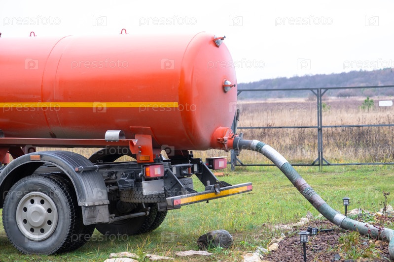Грузовик-ассенизатор извлекает отходы из септика в жилом дворе, утилизации отходов, очистке сточных вод, частных санитарных услугах, экологической службе