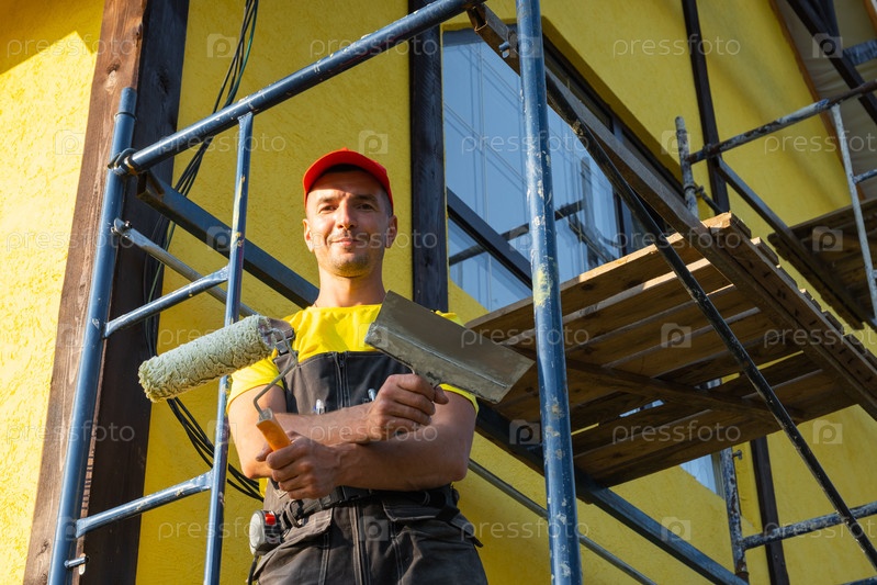 Портрет улыбающегося строителя, ролик краски, окраска фасада, техническое обслуживание, служба ремонта дома, лестница, улучшение, профессиональная команда, звонок клиентов, инструментарий