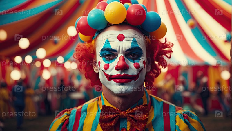 Клоун из цирка с помпом ? классический персонаж, рекламная фотография, креативный дизайн, брендинг событий, приглашение на веселую вечеринку, красочный плакат, семейное шоу