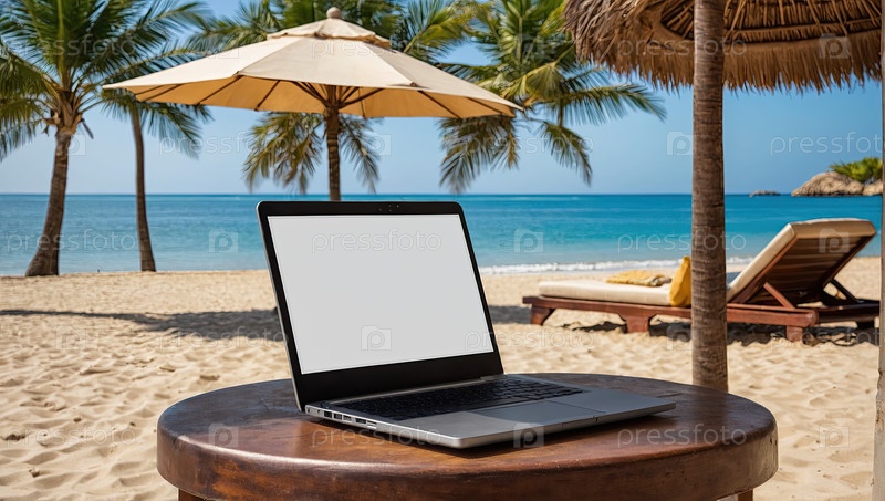 Ноутбук с пустым экраном на открытом столе рядом с морем и зонтиком, пространство для текста, свобода удаленной работы, офисная атмосфера пляжа