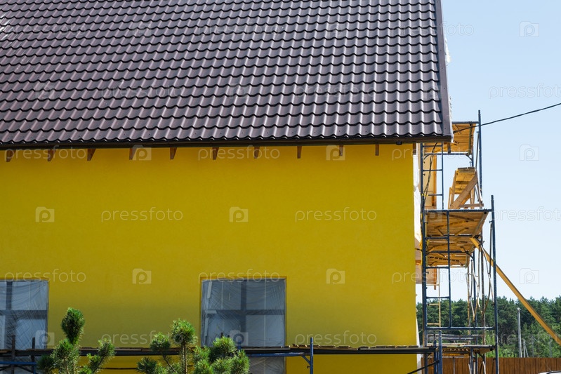 Окрашенный фасад дома, желтая отделка над штукатуркой, реставрация наружной стены, деревянный декор, деревянные доски с полудеревянными деталями, завершено внешнее строительство