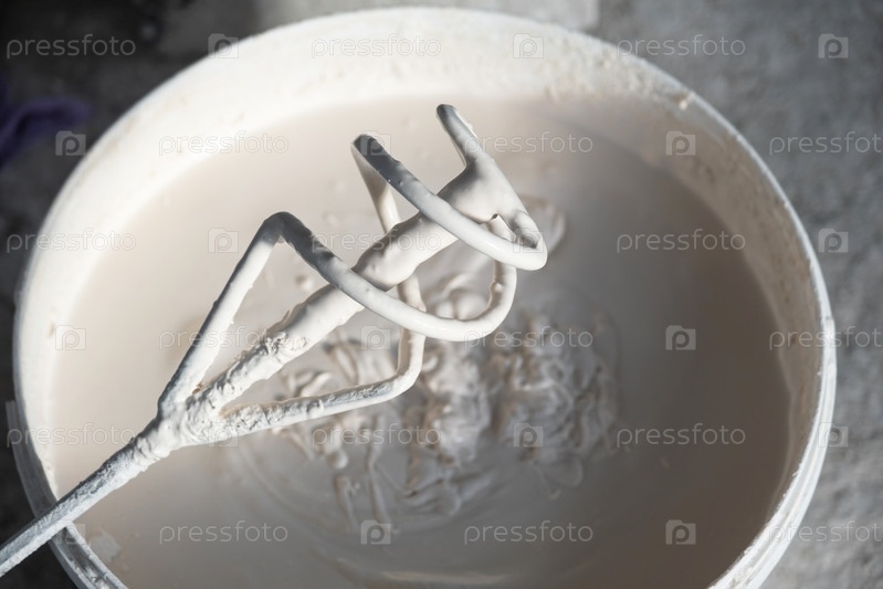 Смесь влажной штукатурки смешивается с помощью бурового миксера в ведрах, реконструкция строительства, подготовка к ремонту стен, инструмент мастеров для работ по поверхности и покрытию