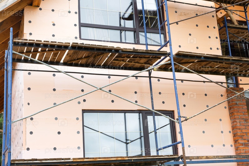 Пеноизоляционные панели на внешней стене, установка скелетов, монтажная доска, реконструкция фасадов, энергоэффективная облицовка, строительство, улучшение зданий, клейкое закрепление