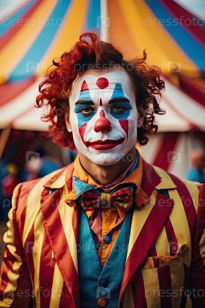 Вдумчивый цирковой клоун-художник ? кадр персонажа, желтый и красный костюм, брендинг фестиваля, плакат, билет, реклама развлечений, флаер для повествовательного мероприятия