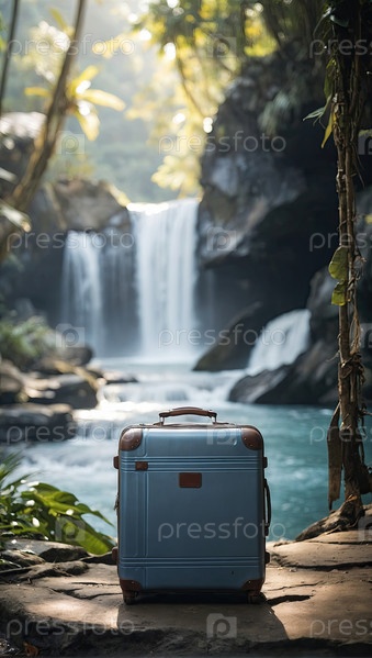 Синий чемодан у водопада в густом тропическом лесу, естественный отдых, вдохновляющее туристическое изображение, экотуризм, живописная тишина