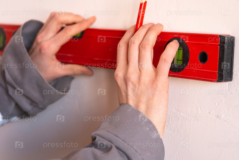 Маркировка с уровнем духа, точные измерения для установки стены, планировки строительства, подготовки к монтажу и работ по реконструкции
