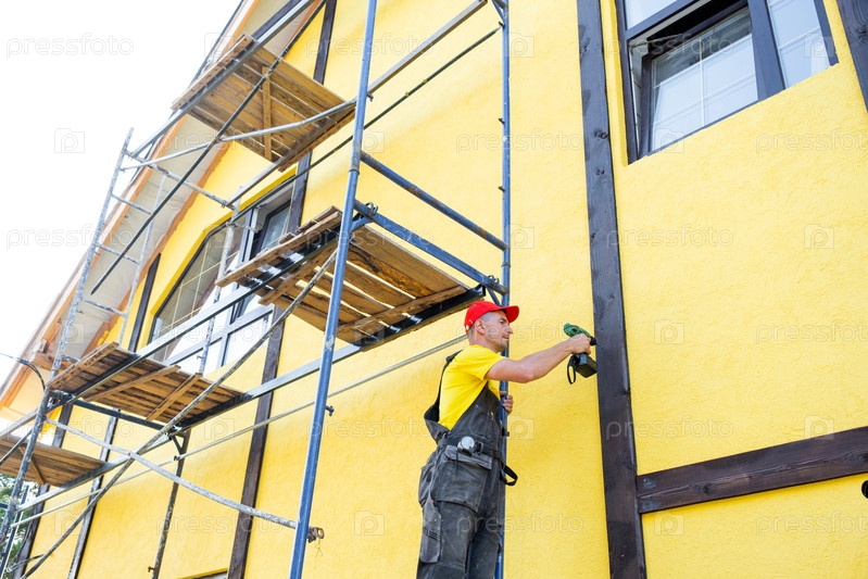 Строитель с помощью отвертки закрепляет деревянные детали на фасаде желтого дома, современный наполовину деревянный экстериор, проект декоративной облицовки, улучшение частного жилья