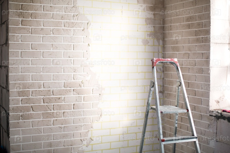 Завершение внутренних стен в доме, подготовка к покраске или штукатурке, ремонт, лестница для работы на высоте, профессиональный ремонт и декорация