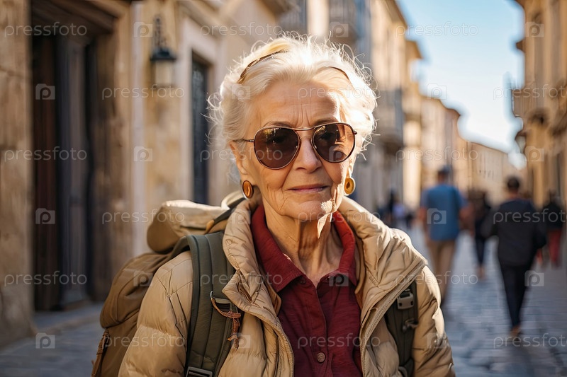Активная пожилая женщина, белые волосы в хвосте лошади, солнцезащитные очки, путевой жилет и рюкзак, странствующая старая городская улица. Сольный женский туризм, проблемы с навигацией, адаптация языка. Идеально подходит для туристических блогов