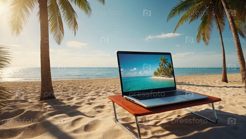 Ноутбук на солярии под ладонью у песчаного пляжа, удаленная фриланс-работа, тропическая работа в интернете, пустой экран для вашего текста