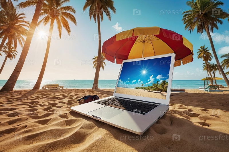 Ноутбук на пляжном песке под зонтиком, работа цифрового кочевника, Wi-Fi интернет, удаленная летняя работа, пустой экран для текста