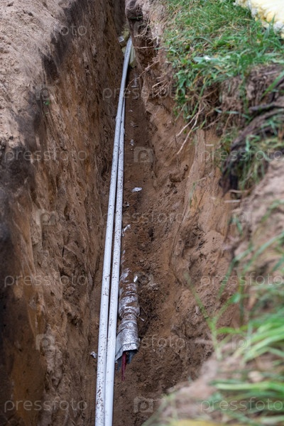 Глубокое рытье траншеи для водопровода, прокладка изолированных труб, теплозащита сантехники, место установки, заземление для подключения коммунальных сетей