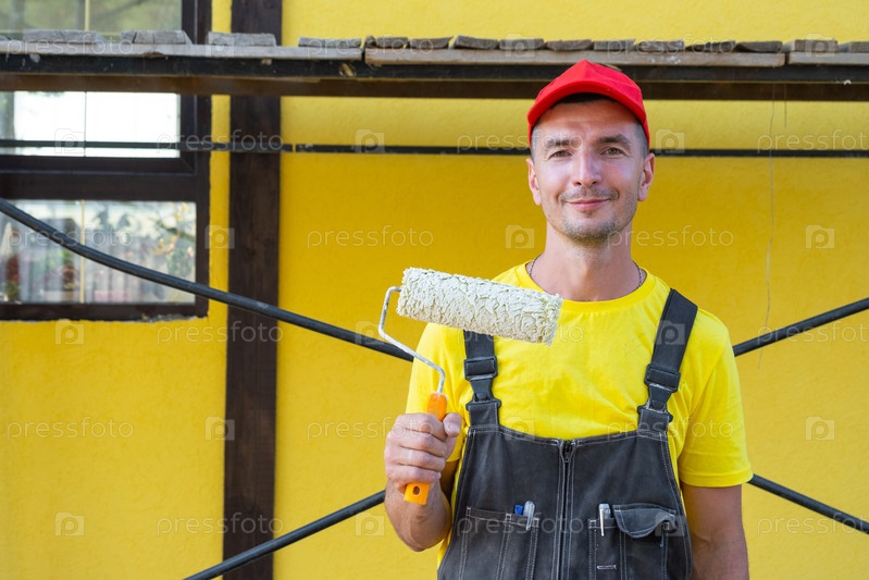 Портрет строителя с роликом краски, домашняя покраска, ремонт дома, услуги мастера по уходу за собой, частный бизнес по ремонту, комплект оборудования для самодельного изготовления, улучшение стен