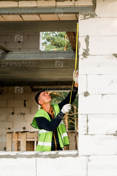 Специалист по строительству работает на окнах, кирпичной кладке, проверяет соответствие рамы, задачи выравнивания, организацию, сооружение стен, технические измерения и командную работу, ремонтные действия