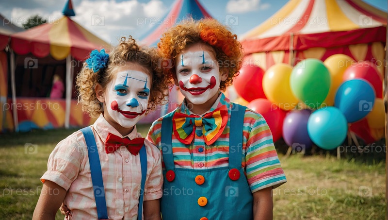 Детские клоуны и воздушные шары на открытом воздухе ? игривая сцена, плакат/флайер/баннер для цирковых вечеринок, мероприятий, фестивалей, счастья, дружбы, магии, веселья