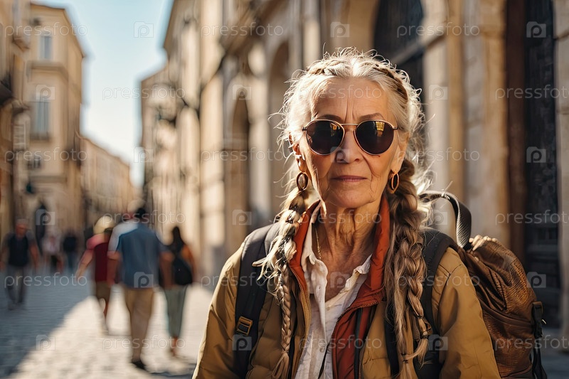 Пожилая женщина, блондинка с плетеными волосами, солнцезащитные очки авиатора, рубашка хаки и туристический рюкзак; независимый путешественник ходит по древнему городу