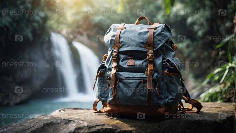 Большой туристический рюкзак на скале у водопада в джунглях, символ треккинга, путешествий, активного туризма, приключенческого образа жизни и спортивного оборудования на открытом воздухе