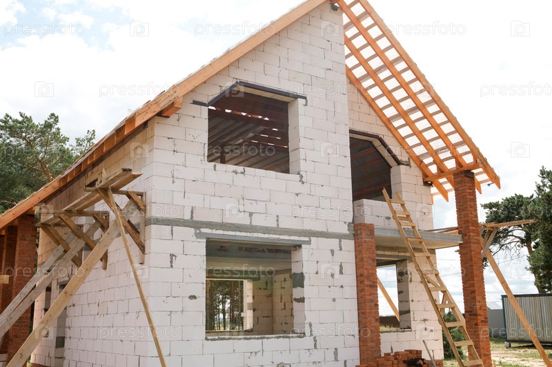 Здание с белым блоком и красным кирпичом, собранная система деревянных стропил, классико-современный гибридный стиль, видимая установка задержки на крыше
