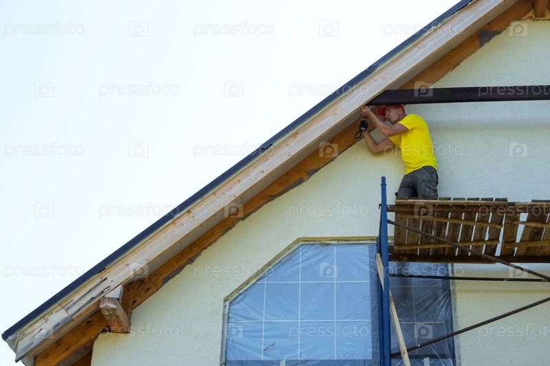 Специалист по креплению скелетов с декоративными отделками на навесах, изолированной белой стеной, современными желтыми акцентами, реконструкцией в действии