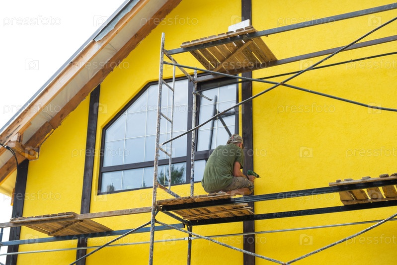 Применение окончательной краски на фасадную штукатурку, внешнюю стену дома, проект реконструкции, желтый цвет, деревянные декоративные полосы, этап технического обслуживания, конечная защита стены