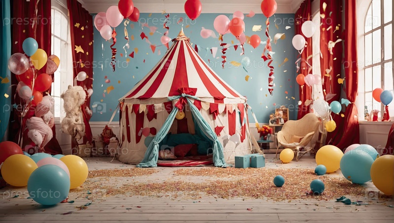 Детская комната с цирковой тематикой ? полосатая палатка, синий и красный декор, обстановка на вечеринке по случаю дня рождения, веселый игривый интерьер для детей, радостное празднование, творческие идеи