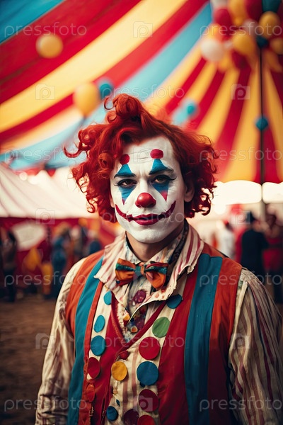 Счастливый портрет циркового клоуна ? полосатый костюм, комическое представление, визуальные эффекты для рекламы, флаер, шоу, билет, плакат, продвижение, детское мероприятие, радостная вечеринка