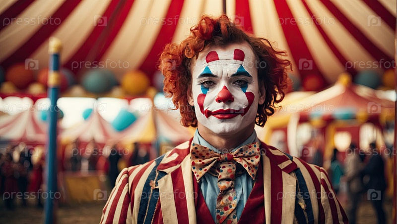 Яркий цирковый клоун с точками полки ? фото мероприятия для шоу, флаера, детской вечеринки, семейного развлечения, фестиваля, комедии, юмора, веселого, веселого, радости, брендинга