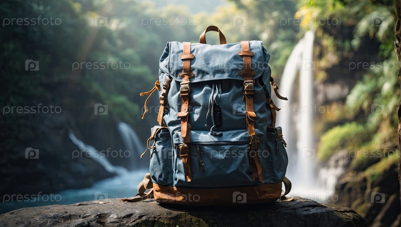 Голубой рюкзак для походов по лесной тропе с солнечным светом, водопадом позади, темами путешествий, туризма, пеших приключений, рюкзаков, исследований и спортивного оборудования