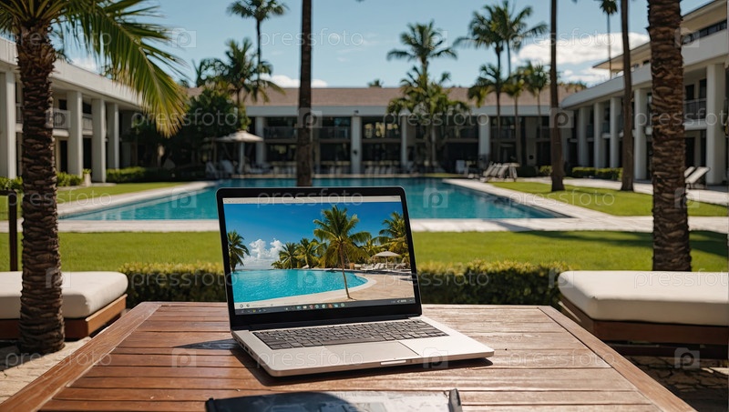 Открытый ноутбук в расслабляющем курортном бассейне, удаленная деловая работа, место проведения онлайн-встреч, свободное рабочее пространство