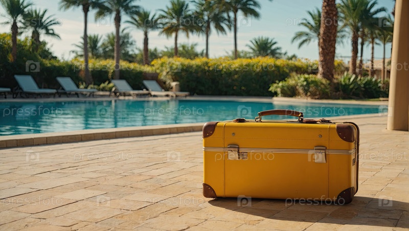 Стильный чемодан на деревянной палубе в курорте, пальмы и бассейн, концепт прибытия к месту назначения, реклама путешествий, горячие предложения, туристическое агентство, текстовое пространство для промо-сообщения