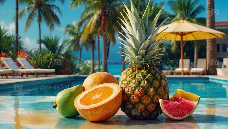 Слайсы апельсина, дыни, манго рядом с бассейном, буфетный завтрак в отеле, тропическое питание, летнее путешествие со всем включенным, реклама еды, баннер меню для туризма