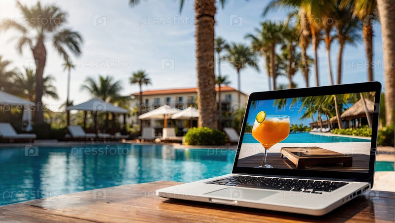 Ноутбук у бассейна с пальмами, рабочее пространство цифрового фрилансера, быстрый интернет, творческая летняя работа, место для текста