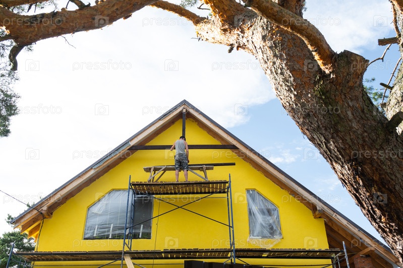Широкий вид ярко-желтого дома с работами по строительству лесов и дверей в процессе, солнечная строительная сцена, улучшение жилища продолжается