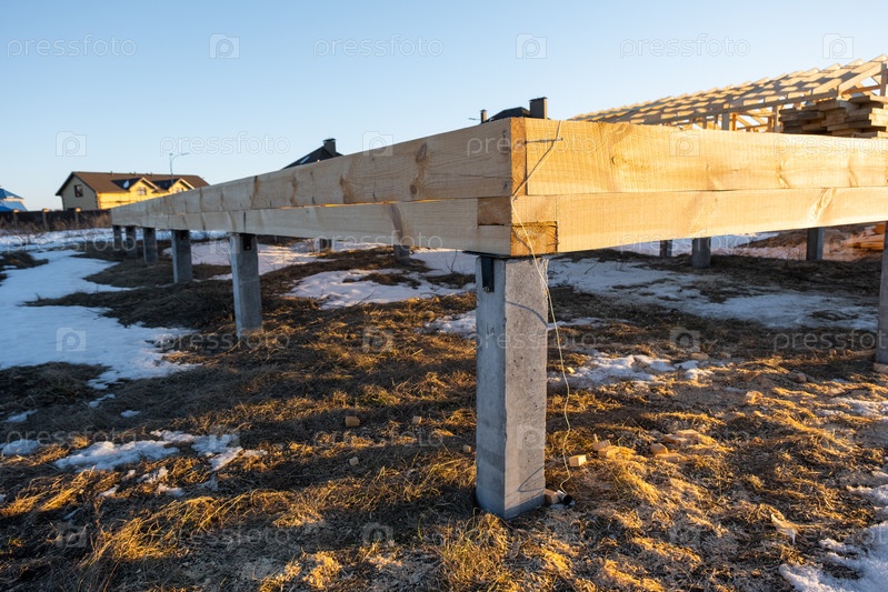 Строительство деревянной рамы на свайях, субструктура основной балки, подготовка к строительству дома, фаза монтажа, работы по сборке столярных изделий, фундамент колоды, установка скелета