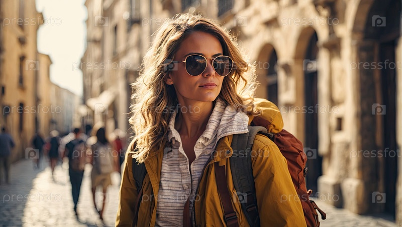 Молодая блондинка в солнцезащитных очках, коричневая куртка, легкий рюкзак для походов, прогулка по старому городу, уверенный сольный турист, самостоятельное осмотр достопримечательностей