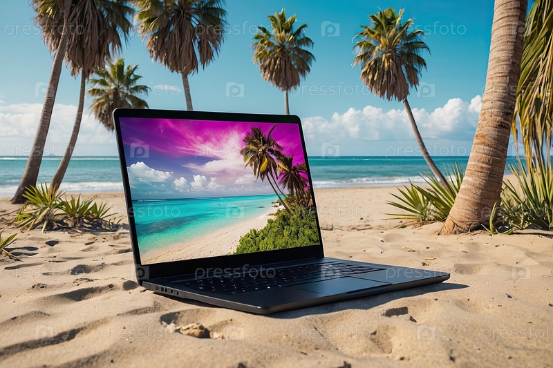 Ноутбук с ярким морским пейзажем на песке, фриланс во время отпуска, доступ в интернет, цифровое рабочее пространство, место для копирования или текста