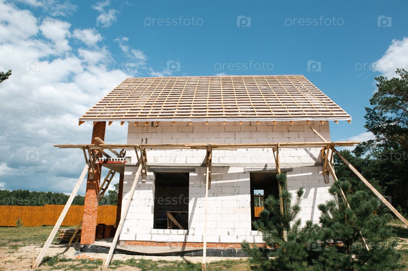 Фронтальный вид на коттедж Eurostyle с деревянными постройками на крыше, незавершенной системой стропилов, ярким небом, современным этапом строительства