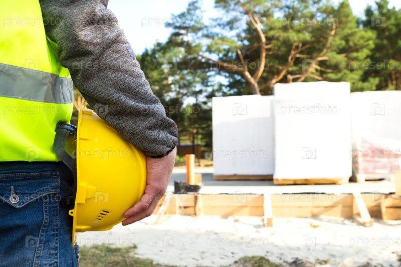 Строительный профессионал носит шлем безопасности, обследует стройплощадку, проверяет ход проекта, управление, планирование, надзор за строительным бизнесом, контроль оборудования