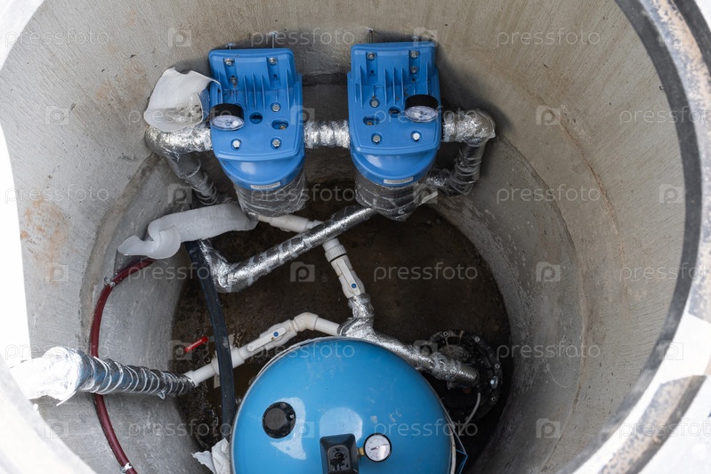Водяной насос, фильтры и резервуар под давлением установлены в скважине, эффективный артезианский источник, сантехника и оборудование для очистки жилого водоснабжения