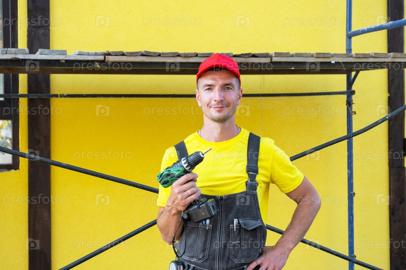 Строитель в красной шапке, держащий электрическую сверлялку, работы по техническому обслуживанию, улучшение жилища, частный сервис уборщика, визит клиента на месте, навыки самостоятельного строительства