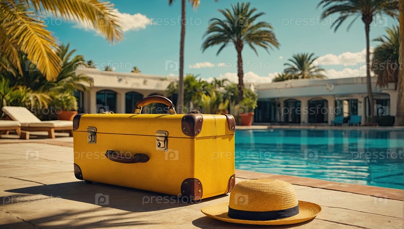 Ваканционный чемодан и соломенная шляпа у бассейна экзотического курорта, пальмы, маркетинг туризма, прибытие, вдохновение для путешествий, летняя бизнес-реклама, пространство для текста баннера