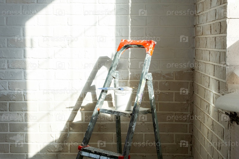 Работа по покраске стен в помещении, лестница и баночка для краски, отделка поверхности, ремонт дома, дизайн интерьера и процесс ремонта, строительные работы