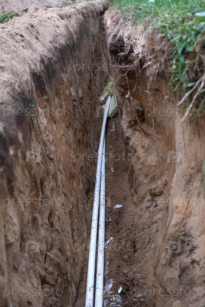 Водопровод, установленный в окопе, изоляционное устройство, водоснабжение, земляные работы на участке, подземная защита, ремонт дома, строительство грунтовых работ