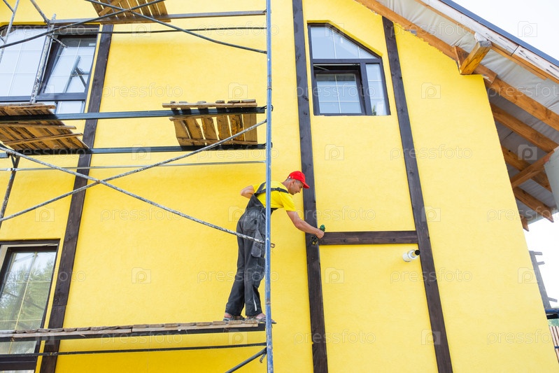 Работник на лесомашинах, устанавливающий декоративную древесину для полупостроенного деревянного экстерьера, отделка фасада дома, профессиональный ремесленник, бизнес по облицовке домов