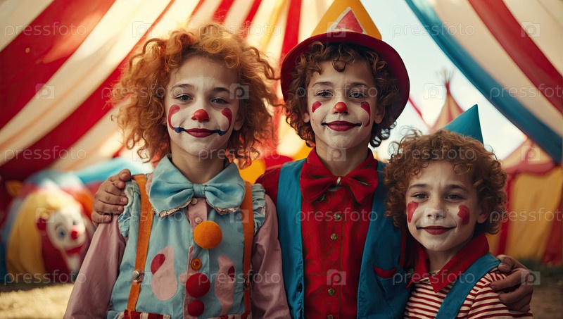 Дети как клоуны под цирковой палаткой? художественные костюмы, веселый макияж, плакат для спектаклей, листовки, семейные мероприятия, вызывают радость, волнение, дружбу