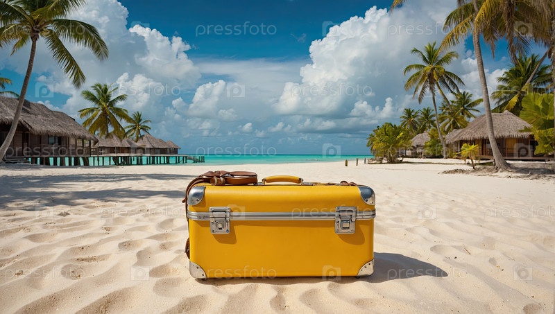 Желтый твердый чемодан на песчаном пляже под пальмами, классический приезд в курорт, рекламная кампания туризма, туристическое агентство, летний бизнес, баннер с возможностью текста