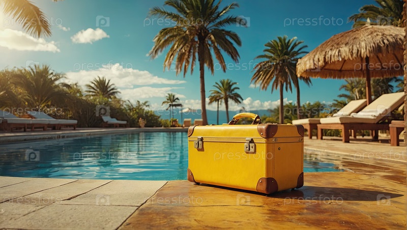 Желтый чемодан на вилле у бассейна, пальмы, вид на океан, концепция прибытия в тропический курорт, летние каникулы, промо турагентства, скидки, текстовая зона для объявления