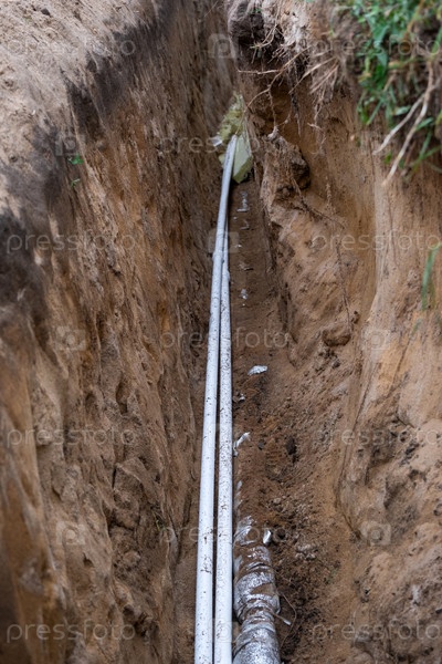 Изолированная водопроводная труба в земляном траншеи, подземные установки, коммунальные линии, заземление на участке, защита сантехники, раскопки каналов, покрытие грязи, ремонт