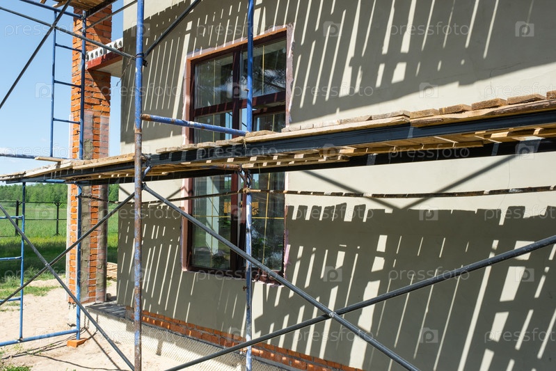 Применение изображения фасада, штукатурки на изоляционной стене, строительных лесов, собранных для наружных работ, выравнивания и сглаживания поверхности, этапа реконструкции здания