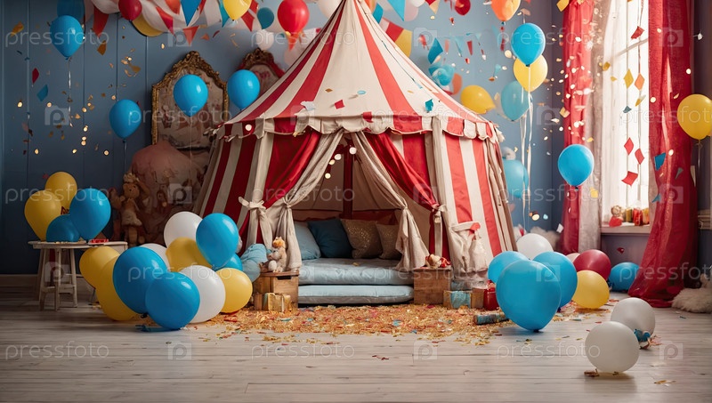 Кровать из цирковой палатки для детской комнаты ? уютный красно-белый декор, воздушные шары, воображаемое празднование дня рождения, игривая вечеринка, причудливый интерьер